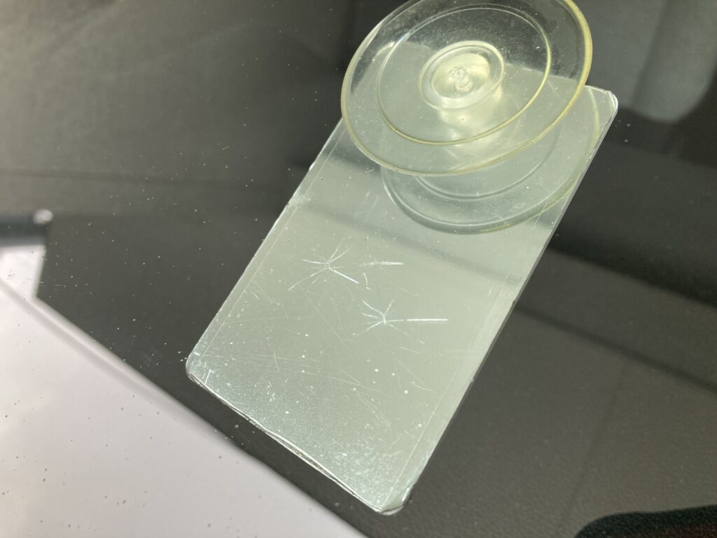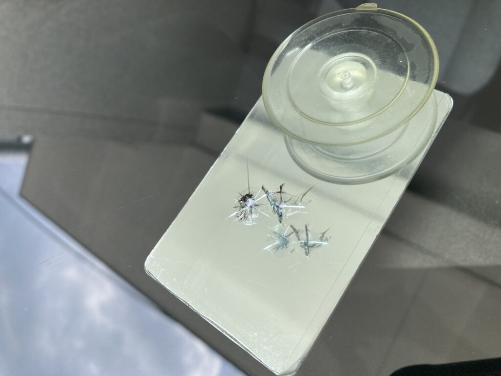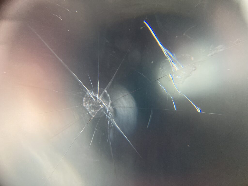 飛び石により衝撃点(石が当たった所)が2ヶ所あり、2つのヒビが出来ています。