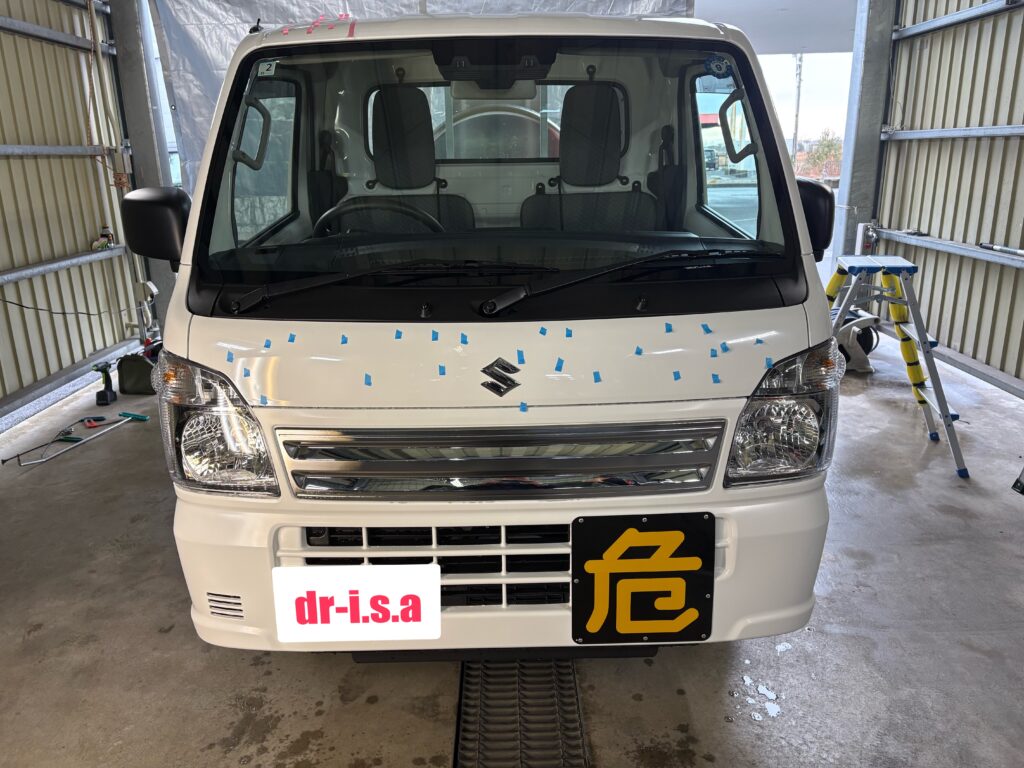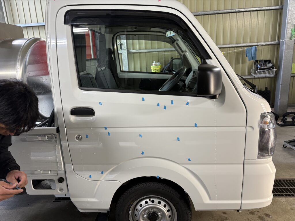 ヘコミの箇所にマスキングテープを貼って被害状況の確認していきます。