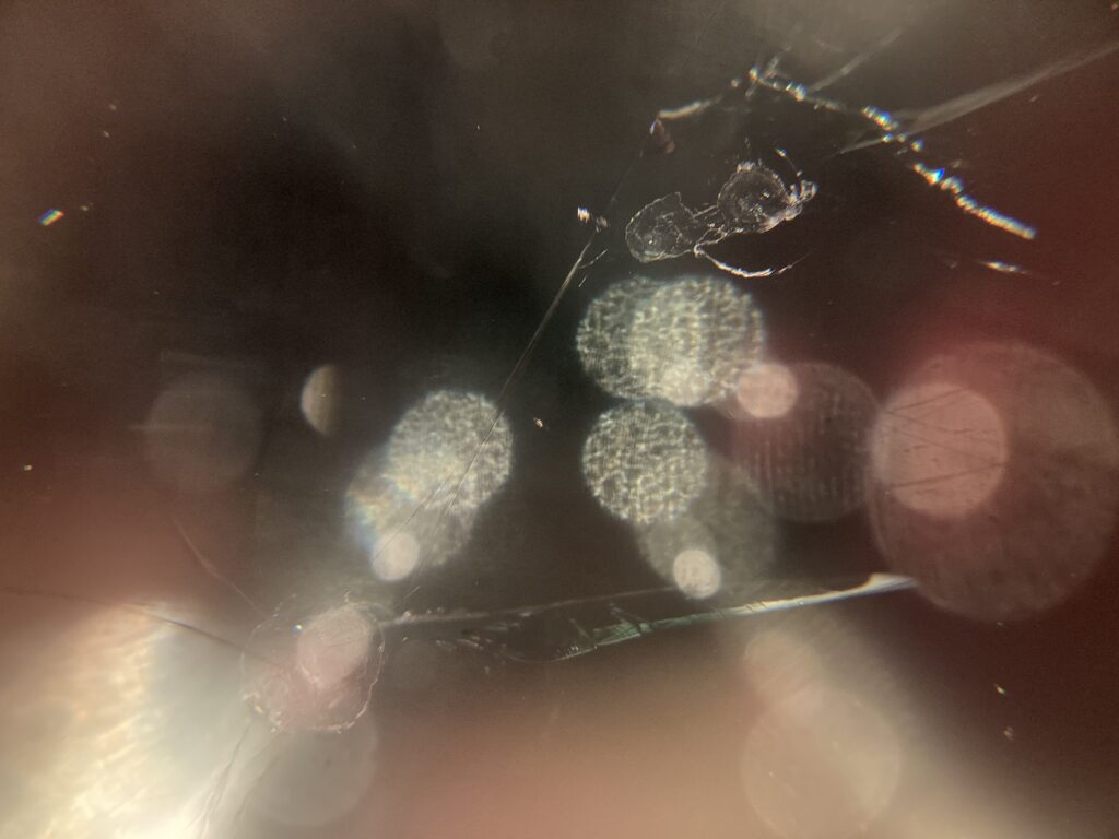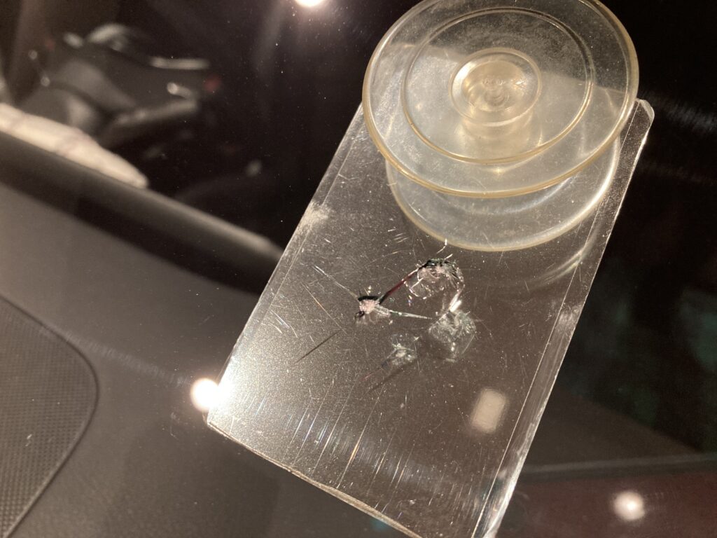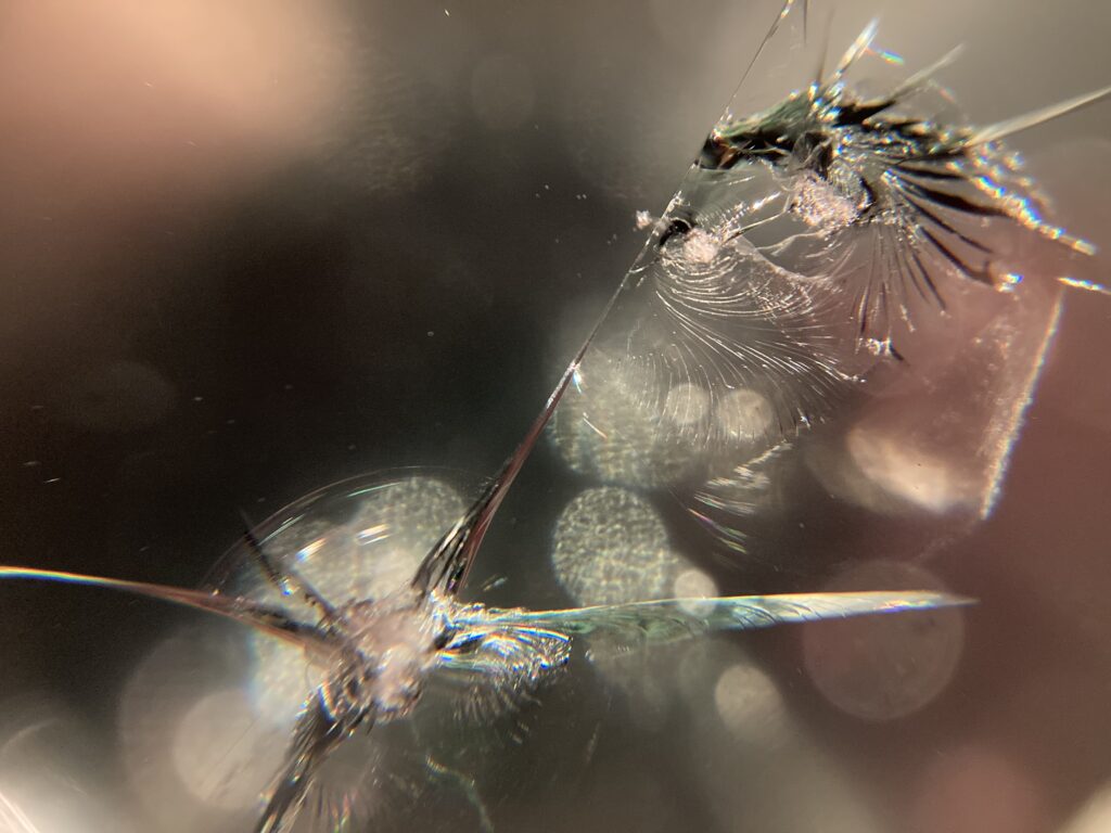 飛び石により衝撃点(石が当たった所)が2ヶ所あり2つのヒビが重なり合った難易度高めのリペアになります。